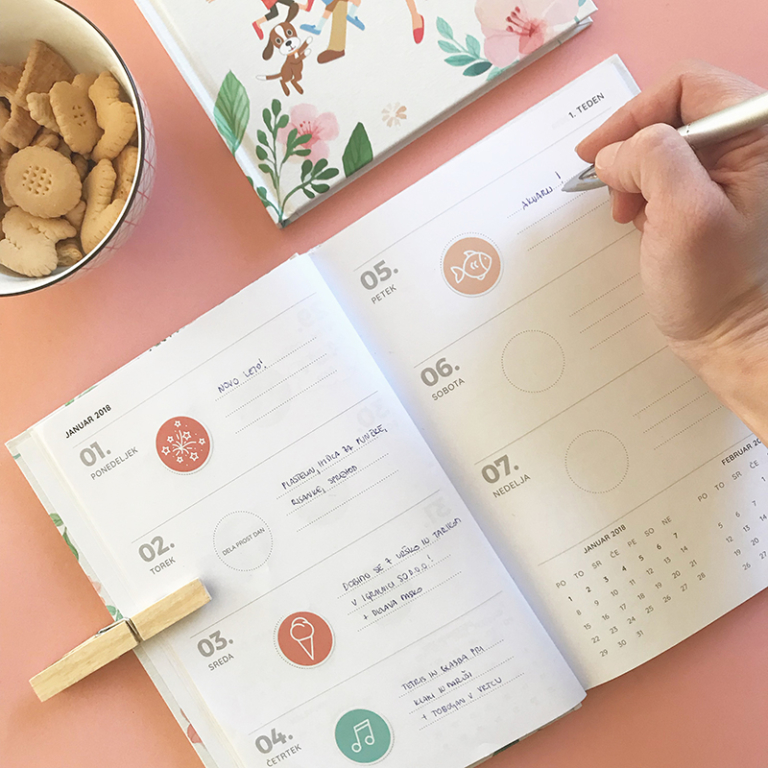 V notranjosti je vsakemu dnevu namenjenega dovolj prostora za zapisovanje aktivnosti, ki se jih boste udeležili s svojo družino. Posebno mesto imajo tukaj krogci, namenjeni nalepkam, priloženim k planerju. Ti bodo razveselili predvsem mlajše člane družine, ki bodo med raznovrstnimi nalepkami lahko izbirali med vrsto zanimivih aktivnosti.